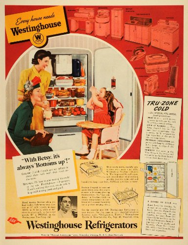 This is an original 1940 color print ad for the Westinghouse Refrigerators from Westinghouse Electric & Manufacturing Company located in Mansfield, Ohio.