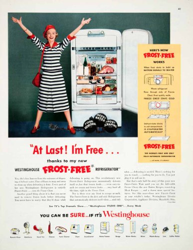 This is an original 1950 color print ad for the Westinghouse Frost-Free Refrigerator. It features a housewife who, thanks to the revolutionary process shown to the right, is free from ball and chain of "Food Removal, Messy Water and Frost Scraping.