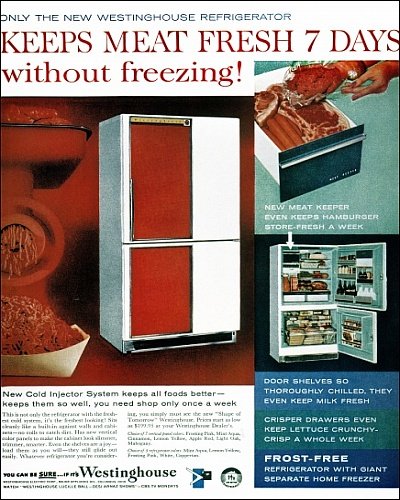 - Image Description: REFRIGERATOR AD, 1959. Adverstisement for the new Westinghouse refrigerator. REFRIGERATOR AD, 1959. Adverstisement for the new Westinghouse refrigerator with cold injector system, from an American magazine