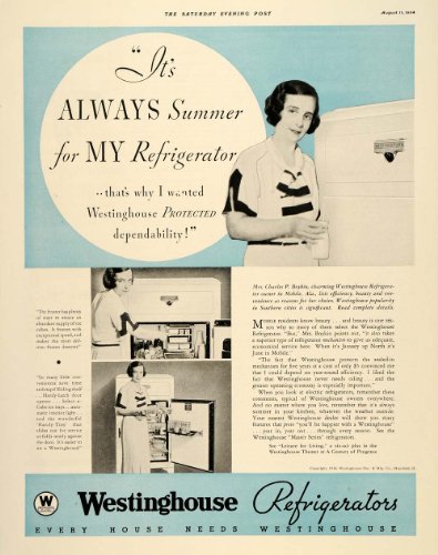 This is an original 1934 color print ad for Westinghouse Refrigerators by Westinghouse Electric and Manufacturing Company located in Mansfield, Ohio.